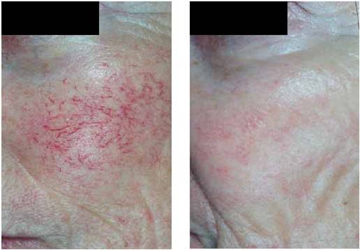 原理:血管中的血红蛋白吸收了特殊波长的能量,血管壁的蛋白质遇热,变性坏死,从而使病变血管被封闭直至消失。